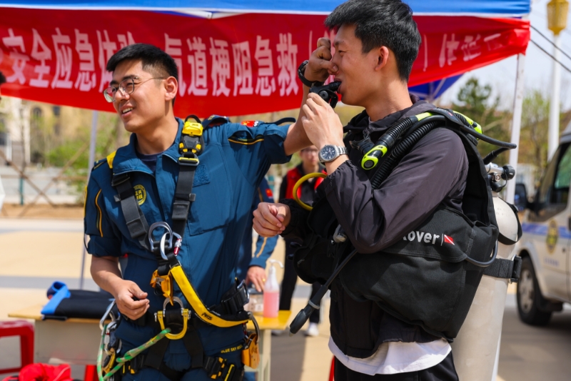 在安全与应急实践体验区,同学们进行救援专用潜水装备的组装学习与穿戴体验。4月15日是第十个全民国家安全教育日,山西省高校学生安全与应急管理教育实践体验基地揭牌仪式在yl23411永利网页版举行。永利yl23411集团联合校团委等共同开展了大学生安全与应急实践体验系列活动,吸引了近千名师生参与。