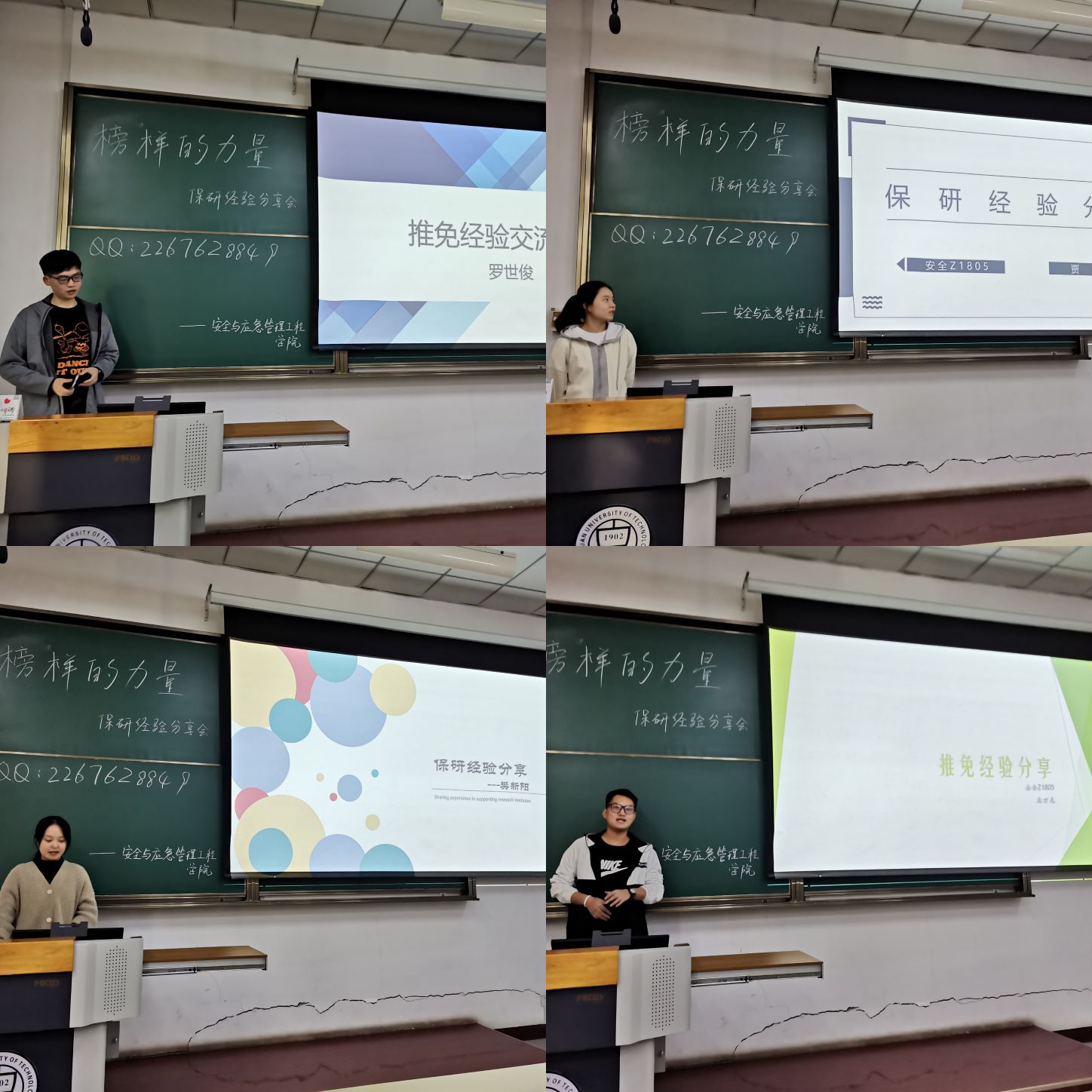 首先由保研到西北工业大学的应万龙就推免方式、学习经验、推免流程等方面进行了详细讲解,他着重强调了学习要针对科目制定不同的学习方法,例如理科类课程要总结题型,熟练掌握往年考试的重点内容,文科类课程,结合不同班级老师强调的重点,寻找相同之处进行记忆;接下来保研到中国科学技术大学的樊新阳主要介绍了各大院校的面试流程与考核内容,与同学们分享了各大院校发布通知的网站和时间,还介绍了中科大学校对于保研同学的相关要求;保研到北京理工大学的贾菀婷分享了自己的保研经历,提出要慎重选择院校,注意时间安排,有针对性地做准备,同时还分享了自己在面试时遇到的问题,提前为同学们敲响警钟;同样保研到北京理工大学的罗世俊学长细致地分析了各个院校的研究方向,给同学们提供参考和帮助。最后在同学们的掌声中,本次经验分享会圆满结束。