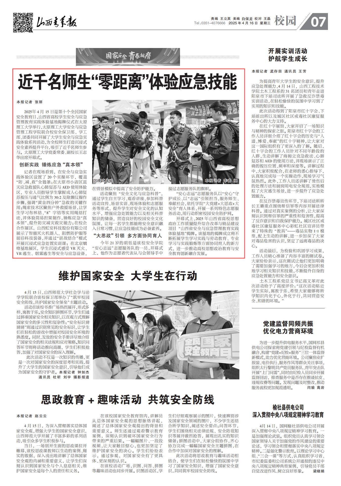 4月16日,《山西青年报》第7版以《近千名师生“零距离”体验应急技能》为题对我院举办的大学生安全与应急实践体验系列活动进行报道。现将全文转载如下。