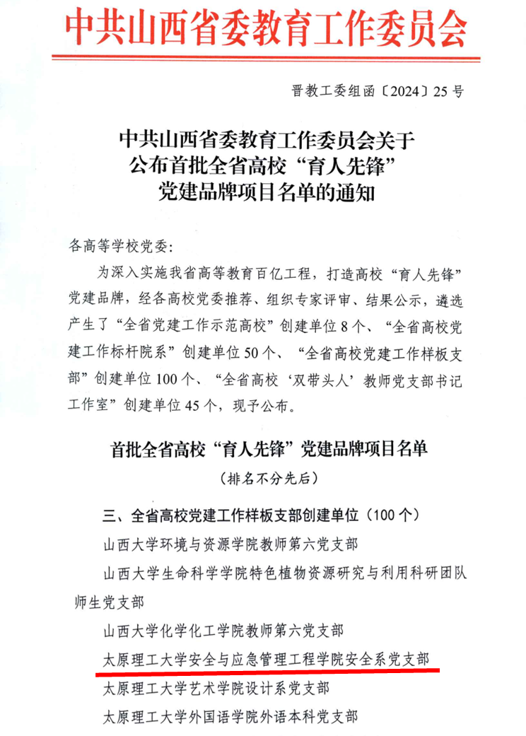 近日,省委教育工委公布首批全省高校“育人先锋”党建品牌项目,安全学院安全系党支部入选“全省高校党建工作样板支部创建单位”。